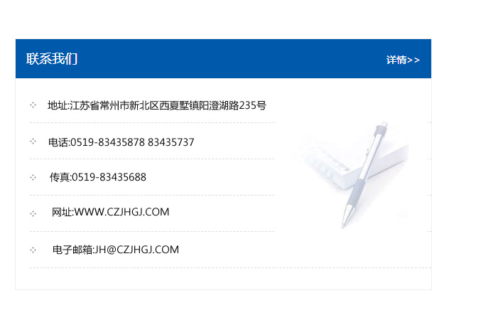 地址:常州市新北區友邦商務大廈1幢16、17層  電話:0519-85101652  傳真:0519-85112595  郵編:213022  網址:www.cz-jiayue_cn.dosxp.net  郵箱:xiajifengaa@163.com